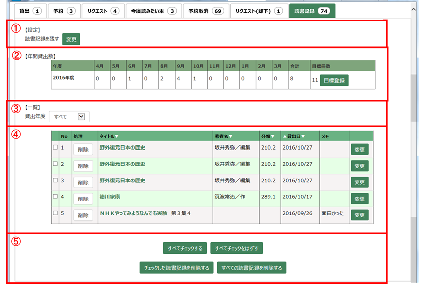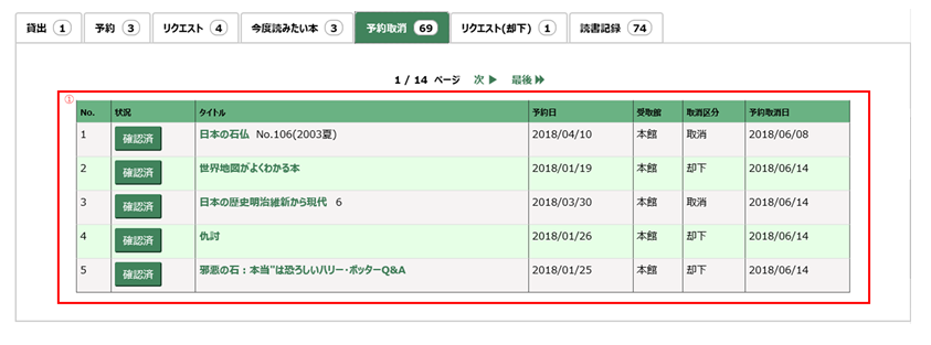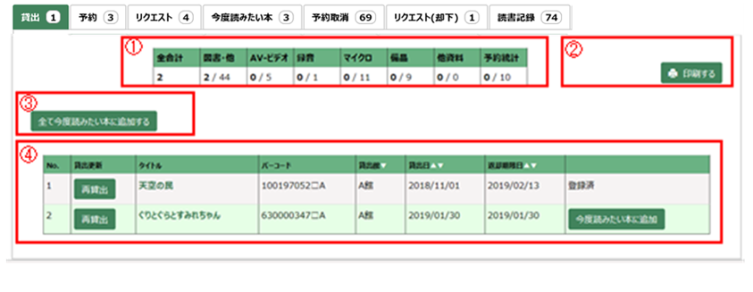 貸出や予約などの利用状況が確認できます。