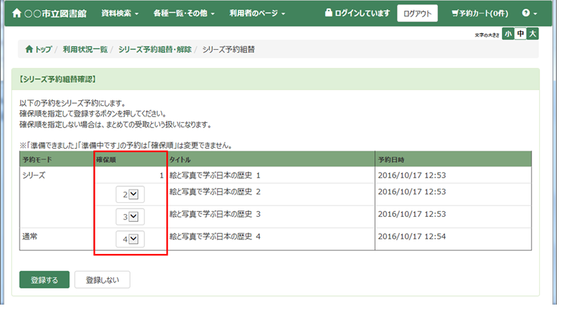 <シリーズ予約組替確認画面(確保順を指定する場合)>