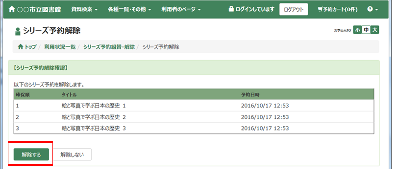 「解除する」ボタンを押すと、シリーズ予約が解除され、自動的に「利用状況一覧」画面に戻ります。