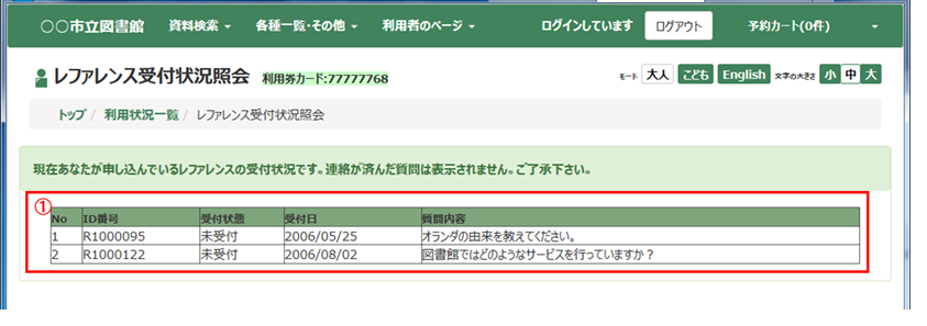 自分が申し込んでいるレファレンスの回答状況を確認できます。