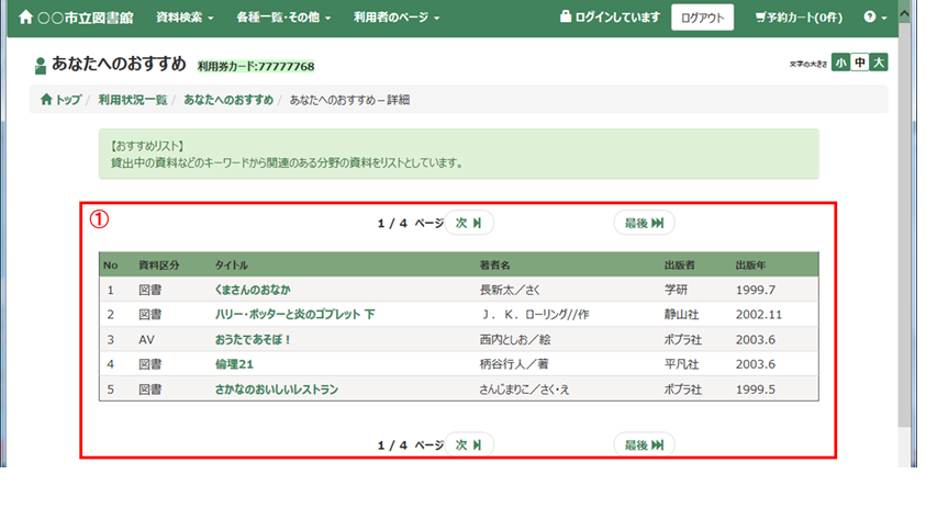 利用者のページでは、利用者個人の貸出状況・予約状況の参照、パスワードの変更や連絡先の変更ができます。